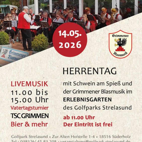 Der Herrentag 2026 im Golfpark Strelasund wird wieder zu einem unvergesslichen Erlebnis für die ganze Familie. Am 14. Mai 2026 laden wir Sie herzlich ein, gemeinsam mit Freunden, Kollegen und Familie einen genussvollen und erlebnisreichen Feiertag in entspannter Atmosphäre zu verbringen.