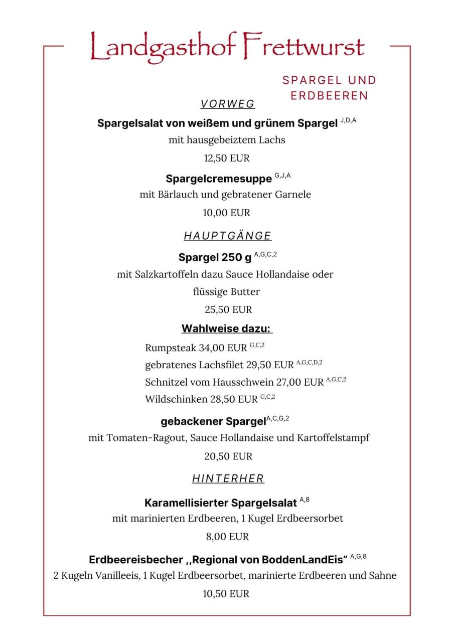 Kaum ein anderes Gemüse wird in Deutschland so sehnsüchtig erwartet wie der Spargel. Nicht umsonst wird er oft als das „königliche Gemüse“ bezeichnet. Die Spargelsaison in Mecklenburg-Vorpommern steht für Frische, Regionalität und leichte Küche – und genau das spiegelt sich auch in der neuen Spargelkarte im Landgasthof Frettwurst wider.